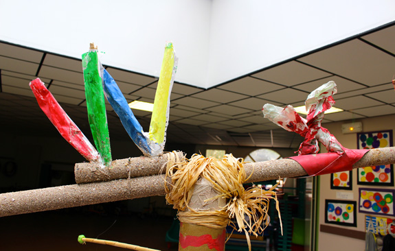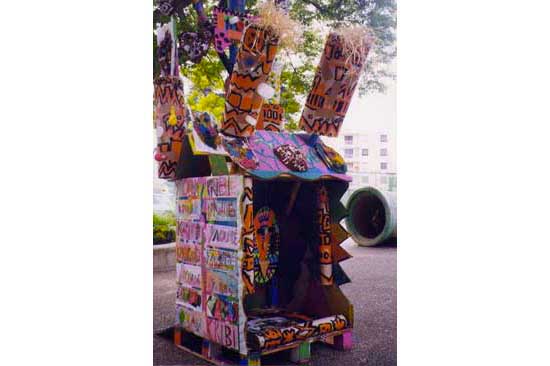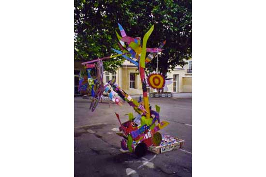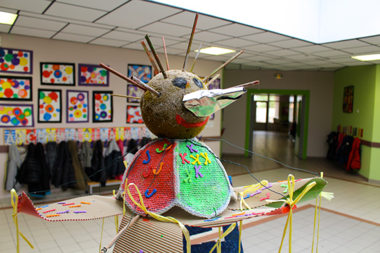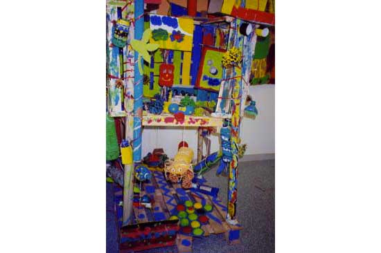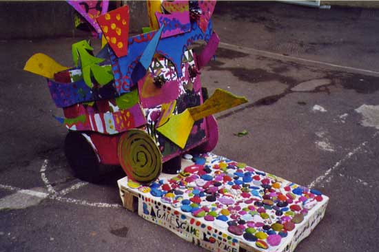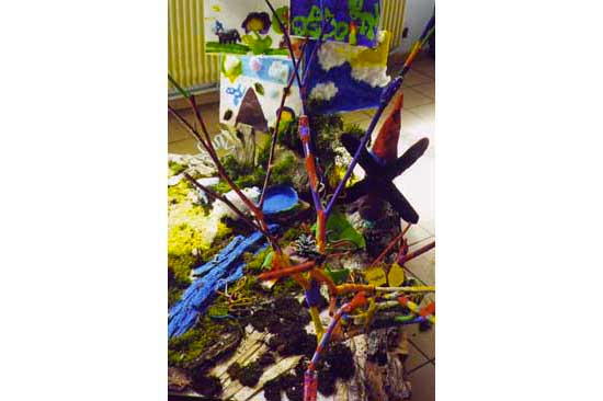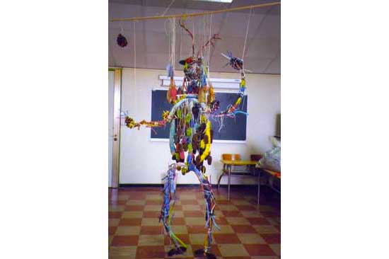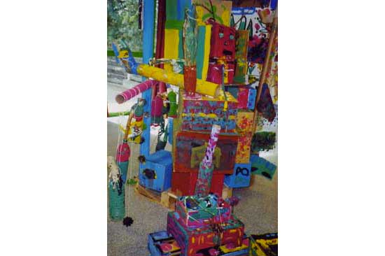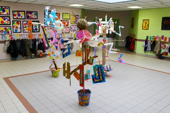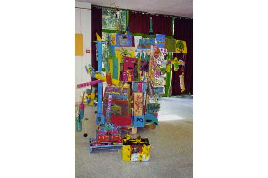 Mes interventions sont motivées par le désir de faire découvrir et partager un moyen d’expression peu abordé en milieu scolaire: la sculpture. Avec tous les élèves d’une classe ou d’un groupe, il s’agit de construire une œuvre collective : un totem ou un mobile.