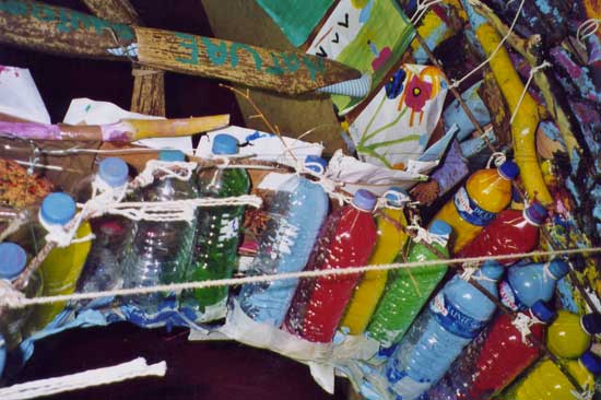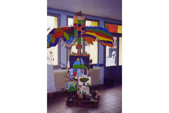 Cette œuvre est centrée sur un thème précis (généralement en rapport avec la nature, l’environnement, les pays, le voyage…), qui permet de guider la démarche créative. Le totem ou le mobile sera donc porteur d’une représentation symbolique liée à ce thème. La sculpture est réalisée à partir de matériaux divers et d’objets, récupérés et/ou fabriqués par les élèves. La construction fait appel à l’improvisation collective, mais aussi à des règles : les « règles de l’art ».