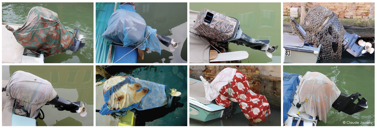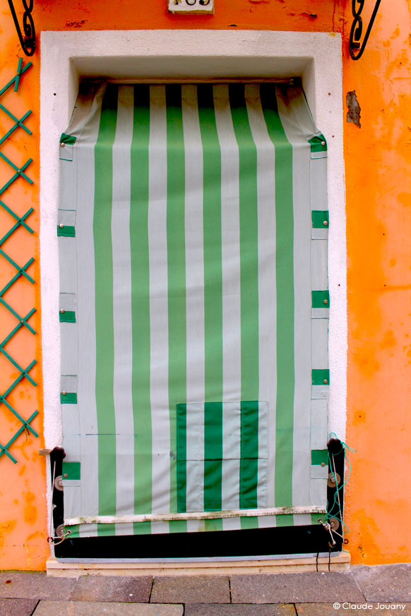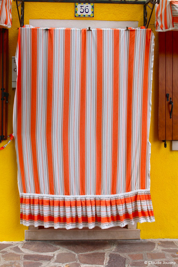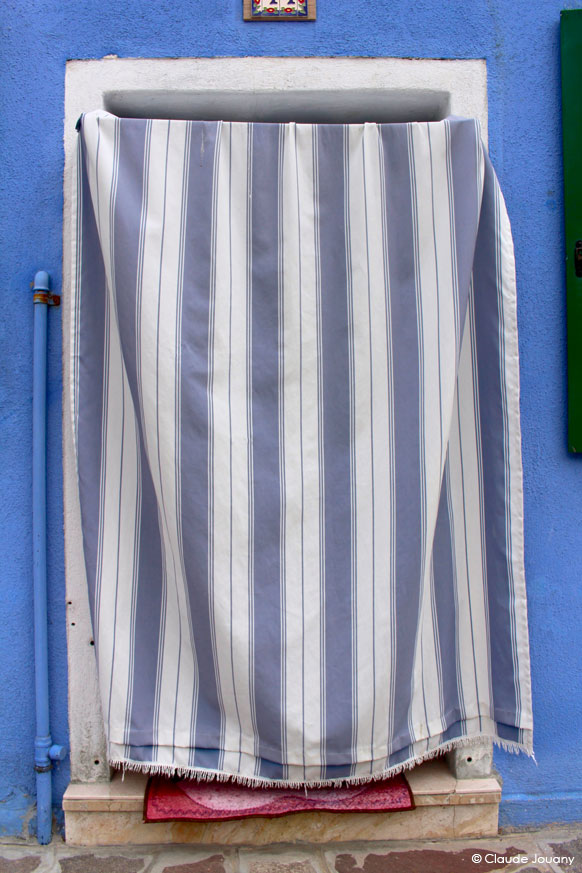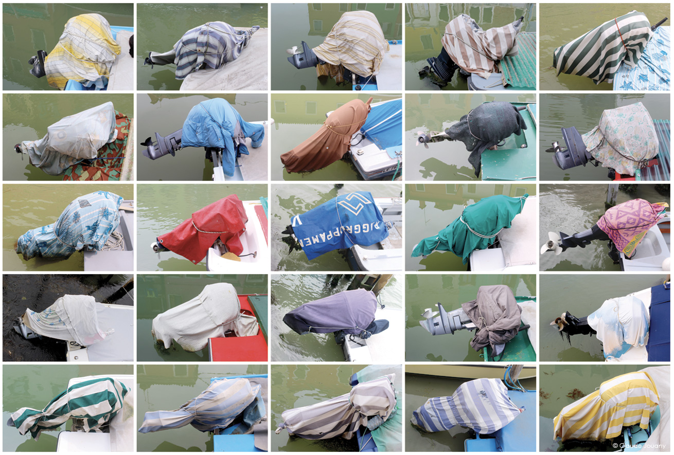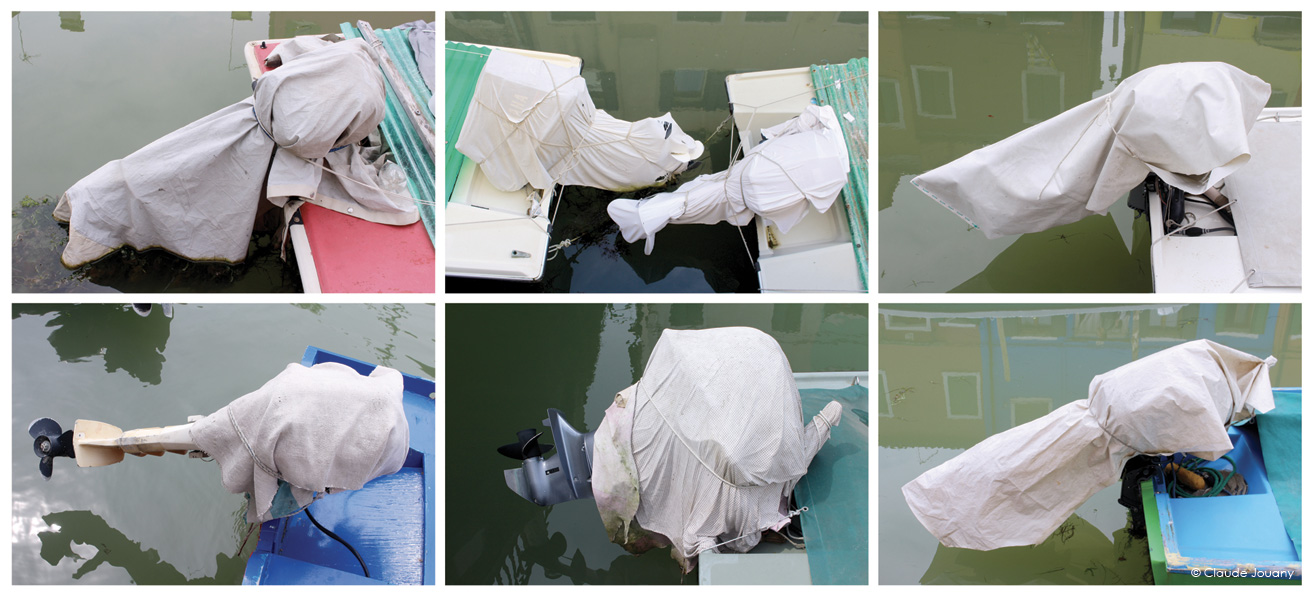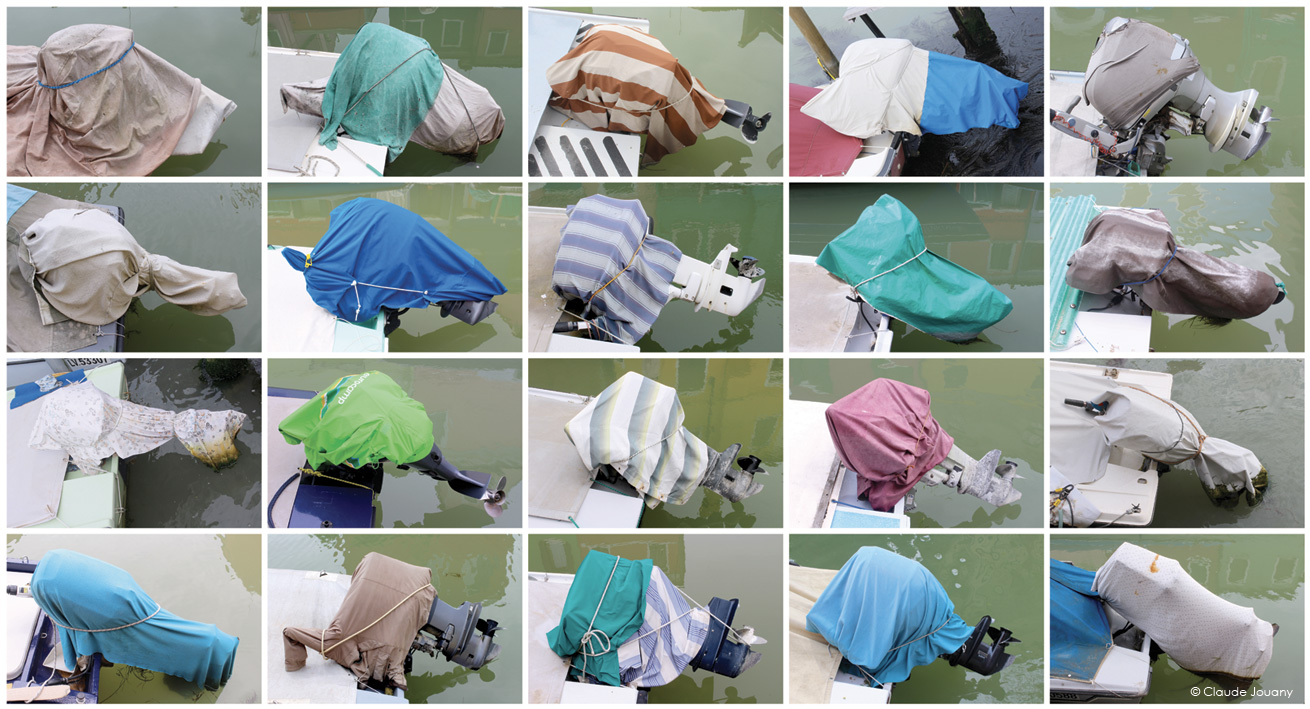 Ici sur l’île de Burano, chaque détail semble raconter une histoire d’intimité et de personnalisation. C’est dans le choix des tissus qui ornent les portes pour protéger du soleil son entrée, ou dans la manière dont des bâches à motifs recouvrent les moteurs des bateaux, que se dessine une relation singulière entre les habitants et leur environnement.