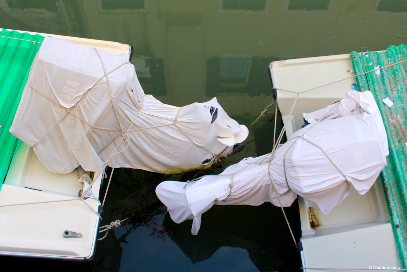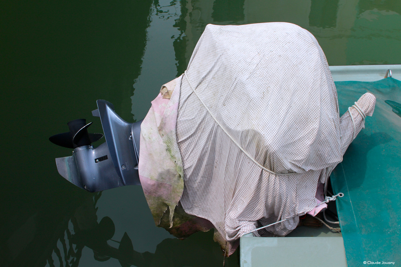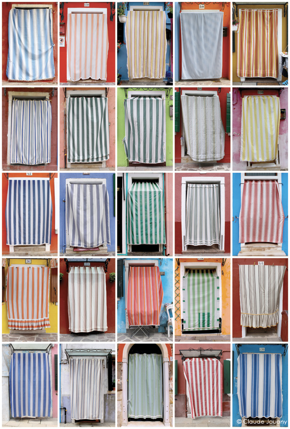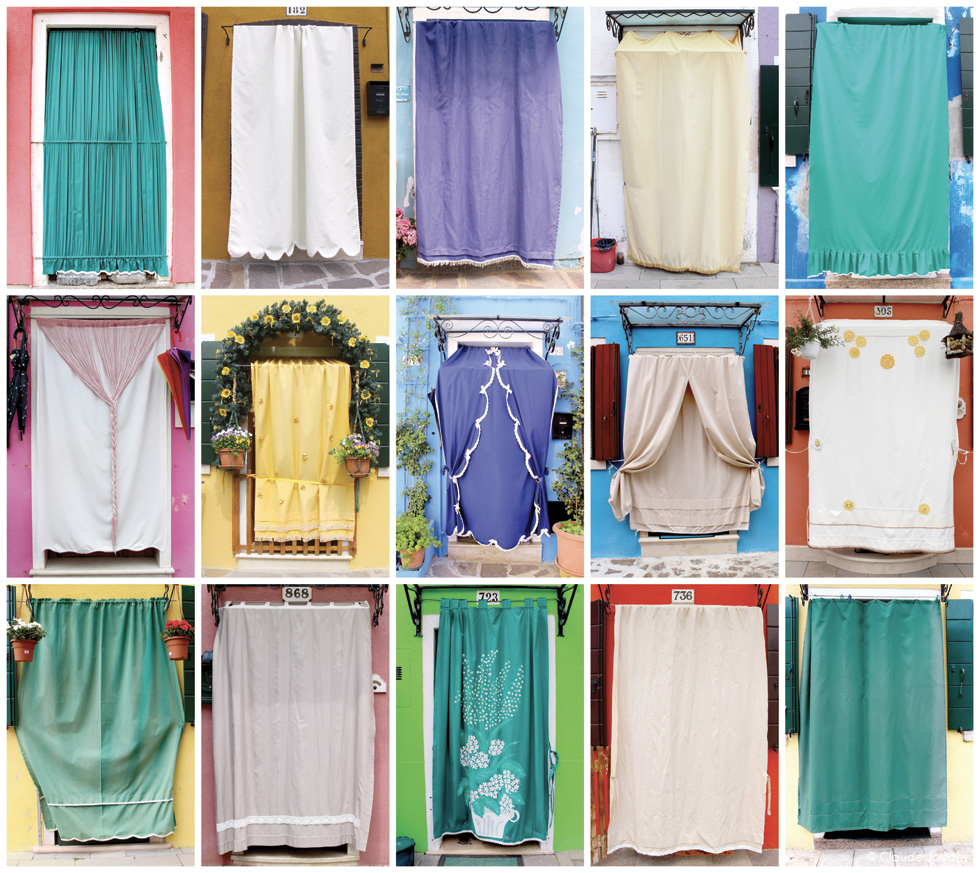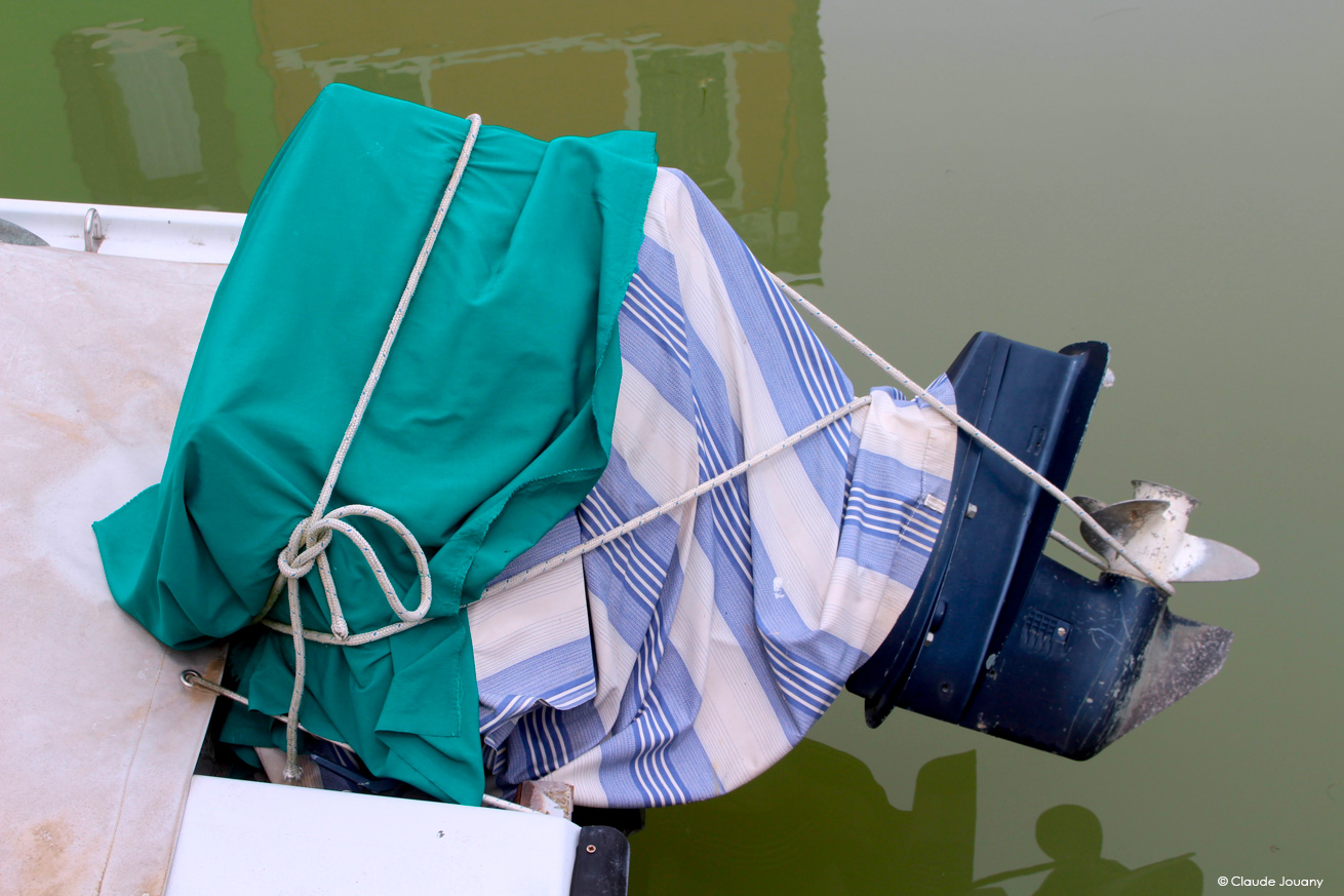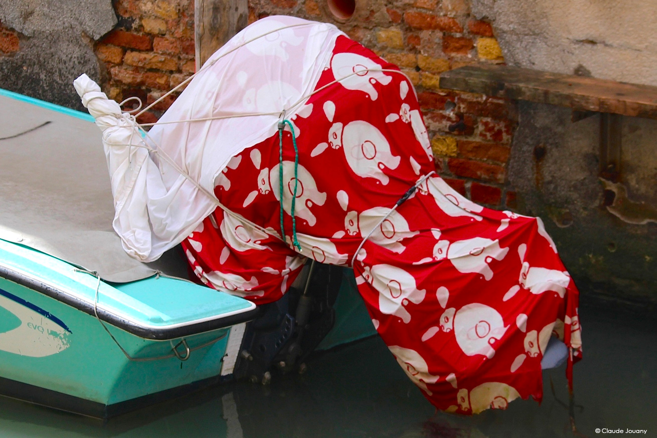 Ici sur l’île de Burano, chaque détail semble raconter une histoire d’intimité et de personnalisation. C’est dans le choix des tissus qui ornent les portes pour protéger du soleil son entrée, ou dans la manière dont des bâches à motifs recouvrent les moteurs des bateaux, que se dessine une relation singulière entre les habitants et leur environnement.