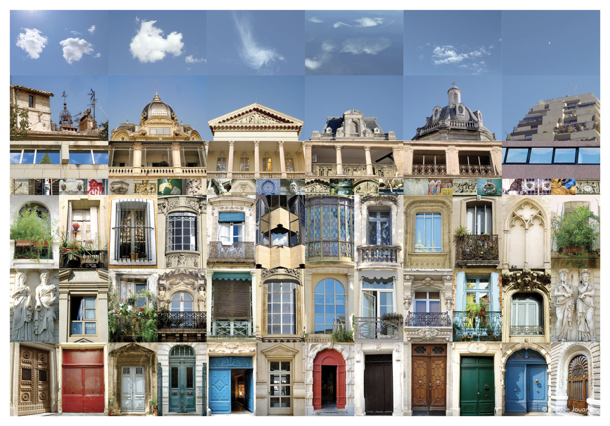 Le projet « Palazzo Montpellier » se déploie comme une composition photographique, combinant des clichés d’éléments architecturaux capturés au détour du centre urbain. Recréant les différents niveaux d’une bâtisse inspirée des palais vénitiens, des photographies de ciels, toitures, coursives, surplombent celles de fenêtres, et enfin de portes qui parachèvent l’édification de la façade. Intégrée à la façade, une frise présente des photographies de tous les détails connus et moins connus d’architecture, d’art, et d’histoire de la ville.